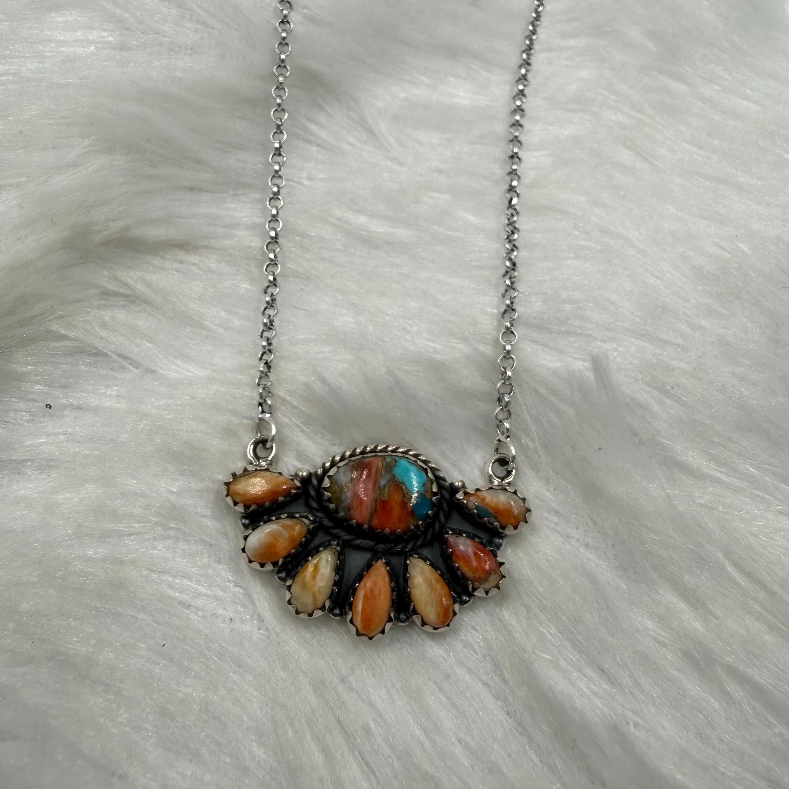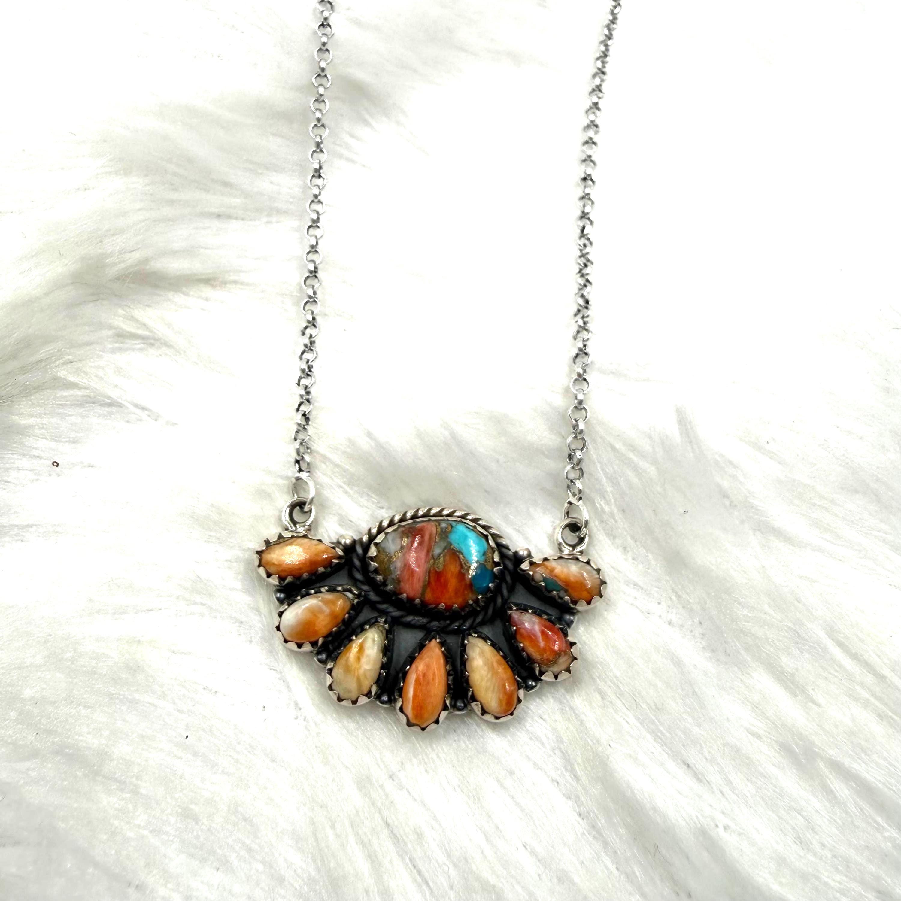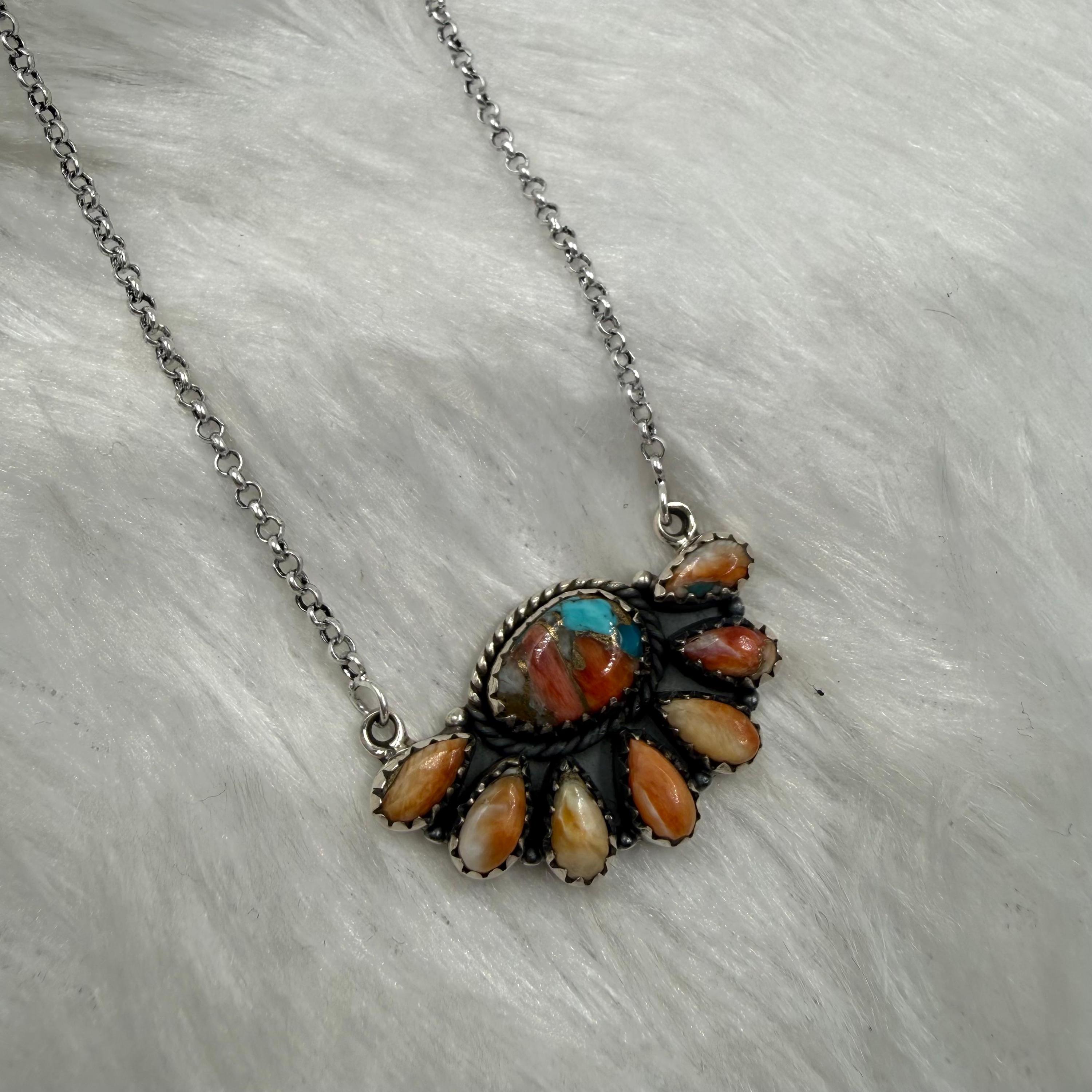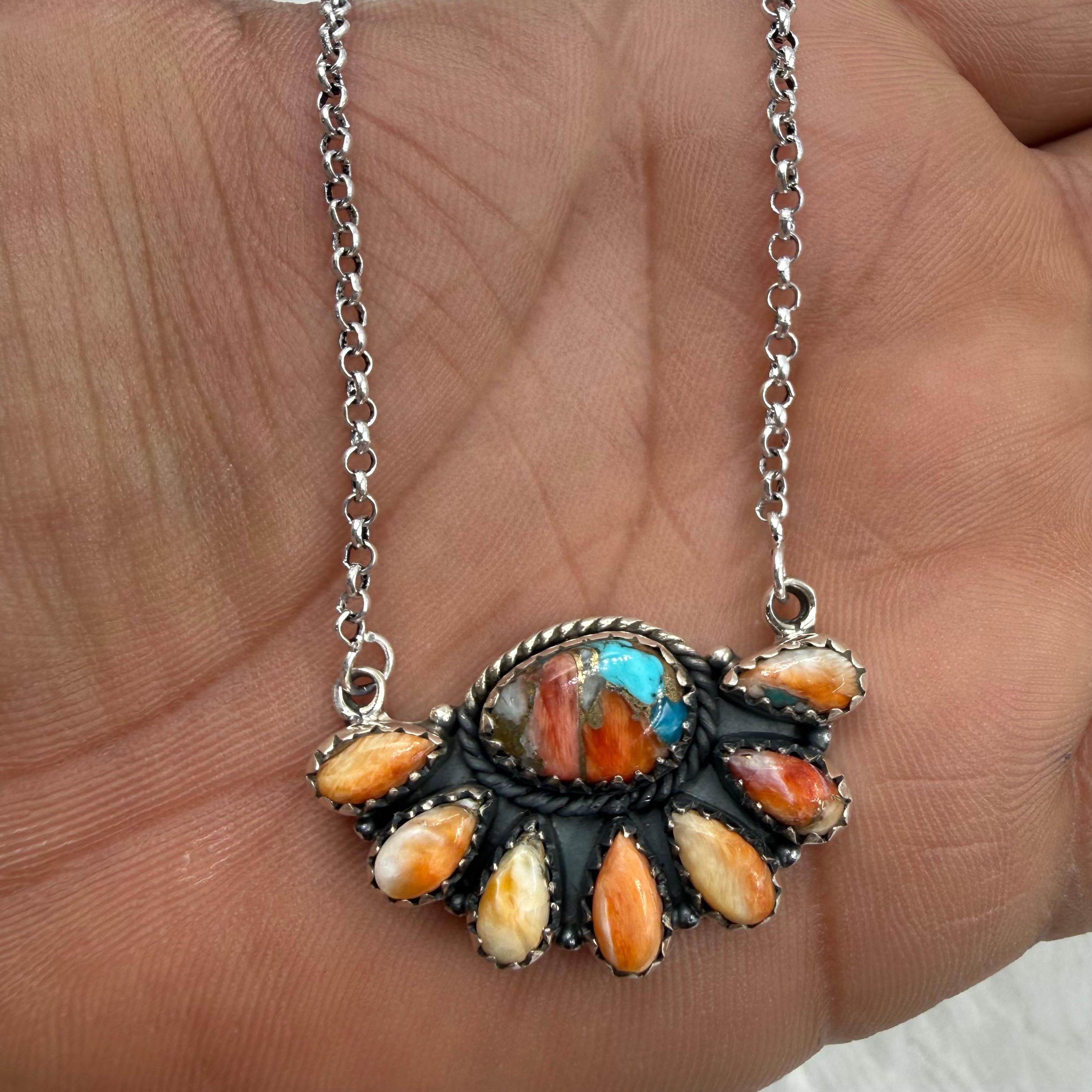 Spiny oyster Turquoise Cluster Necklace: Sterling Silver Southwest jewllery (18" + 2" Extender) gift fo her